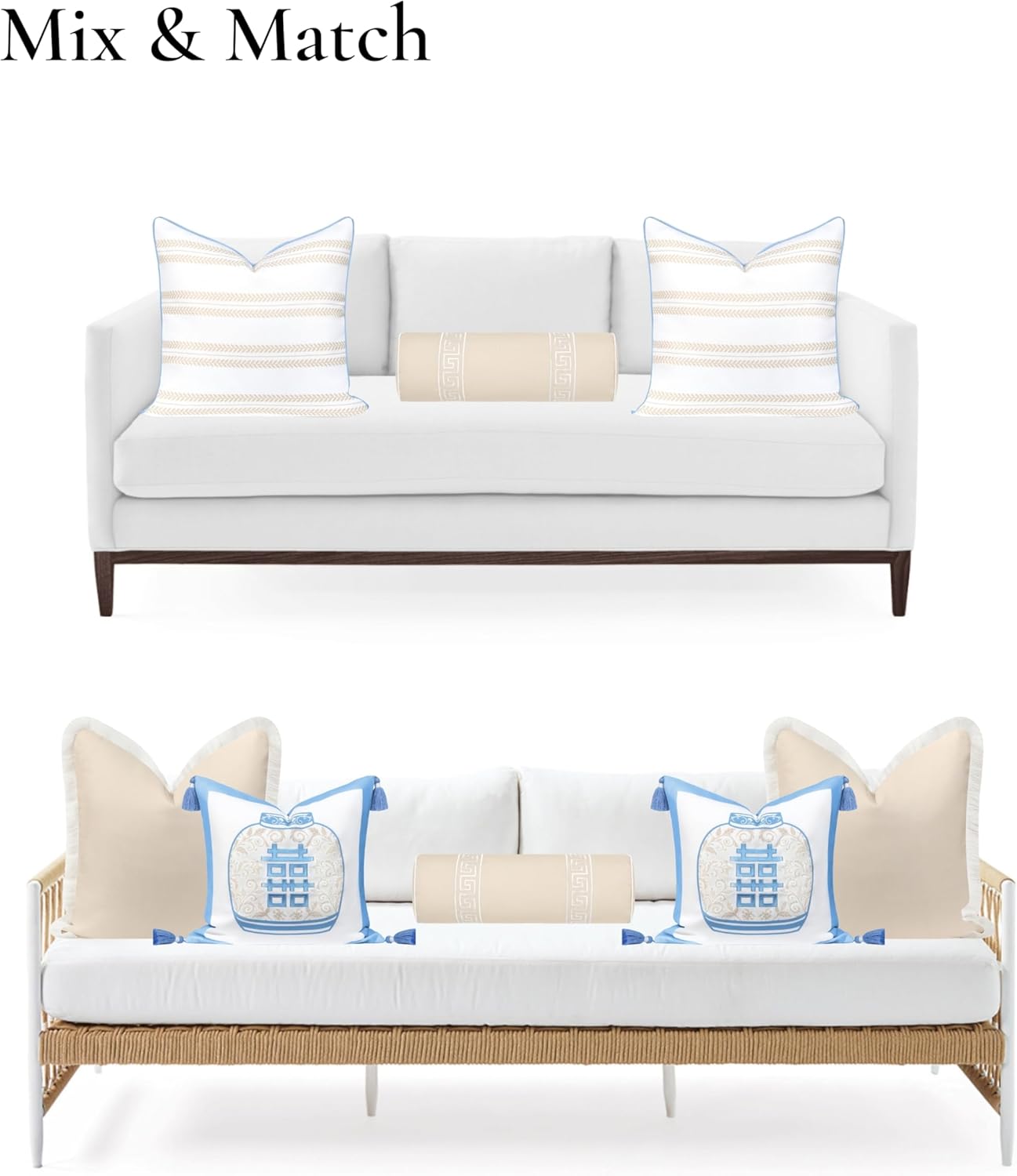 Hofdeco Premium Coastal Hampton Patio Indoor Outdoor Bolster Pillow Cover Only, 8"x24" Water Repellent for Backyard, Couch, Poolside, Neutral Tan Embroidered Greek Key