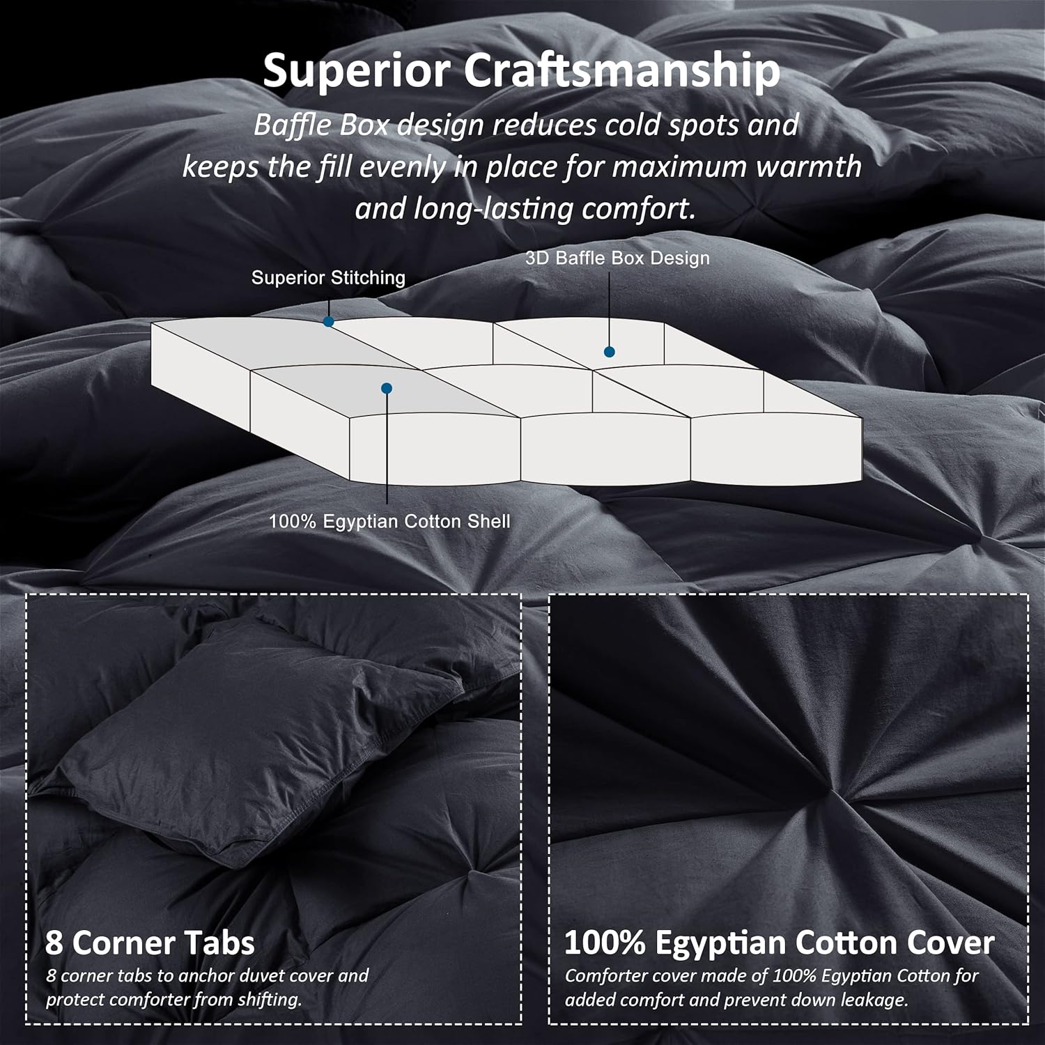 Luxurious All-Season Goose Down Feather Fiber Comforter California King Size Duvet Insert, Exquisite Pinch Pleat Design, Premium Baffle Box, 100% Egyptian Cotton Cover, 80 oz. Fill Weight, Black